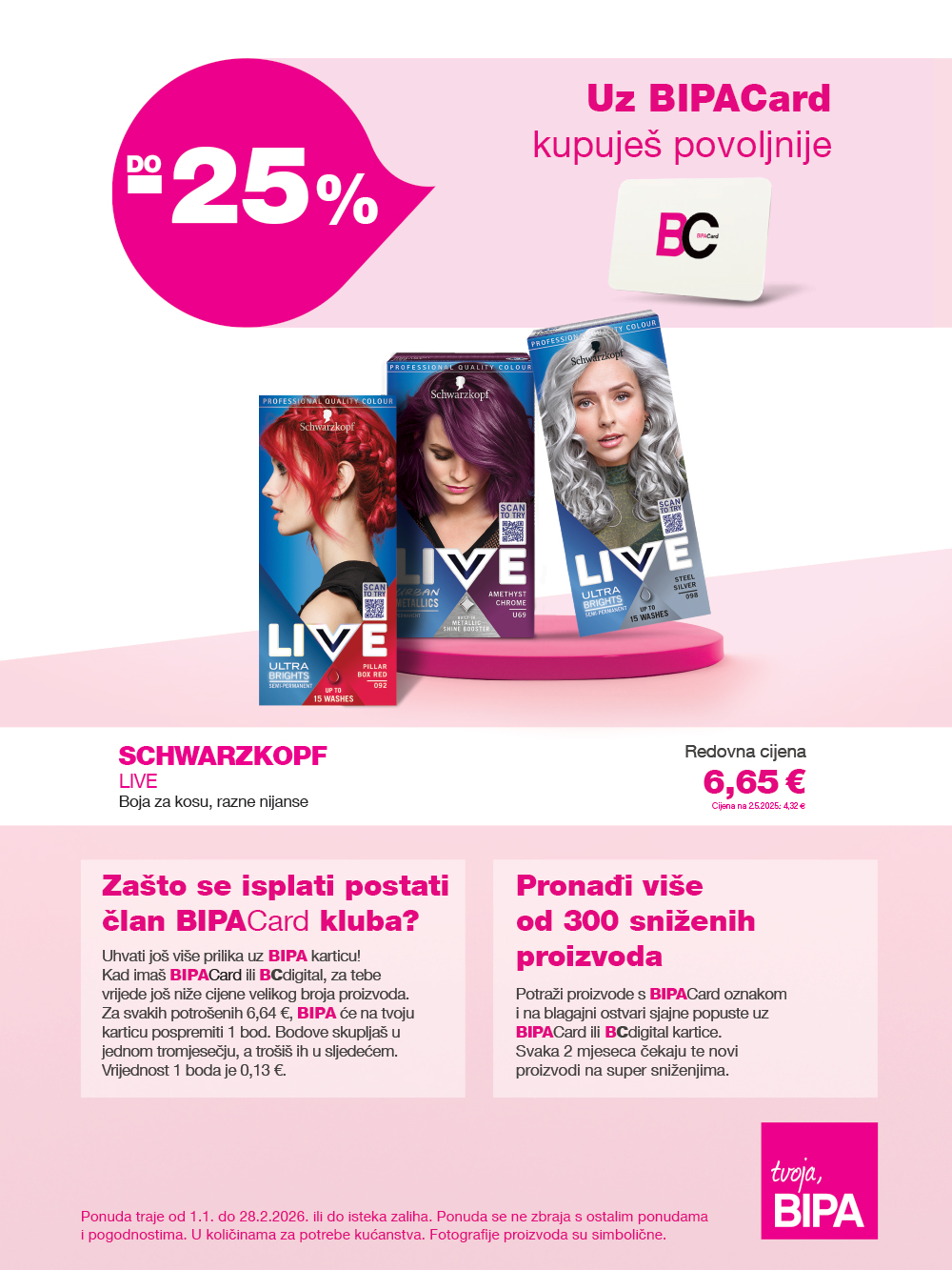 *Ponuda se ne zbraja s ostalim ponudama. U količinama za potrebe kućanstva. U ponudu nisu uključeni poklon paketi. Fotografije proizvoda su simbolične. BipaCard cijene vrijede za sve kupce koji na blagajni predaju BipaCard karticu. Redovne cijene su naše maloprodajne cijene i vrijede za kupce koji još nemaju BipaCard karticu. BipaCard program vjernosti se ne zbraja s ostalim ponudama i pogodnostima.