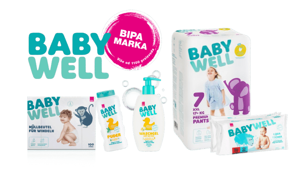 Koža vaše bebe još je uvijek vrlo osjetljiva i potrebna joj je kvalitetna njega. BIPA marka – BABYWELL proizvodi za njegu prilagođeni su u potpunosti njihovim potrebama – posebno su blagi, strogo kontrolirani, bez sastojaka na bazi mineralnih ulja i bez hormonski aktivnih dodataka. Bilo da se radi o vrhunskim pelenama ili praktičnim svakodnevnim dodacima – uz BABYWELL ćete pronaći sve što vašoj bebi treba.
