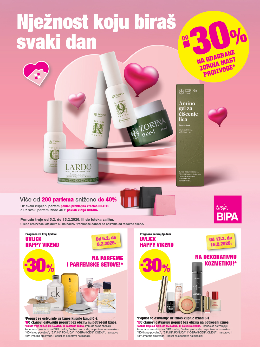 Popust se odnosi na sniženje od redovne cijene, a navedene cijene su već umanjene za iznos popusta. Ponuda se ne odnosi na proizvode s oznakom “BIPA MARKE” i “OGRANIČENA CIJENA”. Ne zbraja s ostalim ponudama, BIPACard, BCdigital i BIPO klub programom vjernosti. Popusti 1+1, 2 za 1, -50% i više se ne mogu kombinirati niti zbrajati s rođendanskim kuponom, kuponom godišnjice ili dobrodošlice. U ponudu nisu uključeni poklon paketi i proizvodi na rasprodaji. U količinama za potrebe kućanstva. Fotografije proizvoda su simbolične. Za eventualne tiskarske pogreške ne odgovaramo.